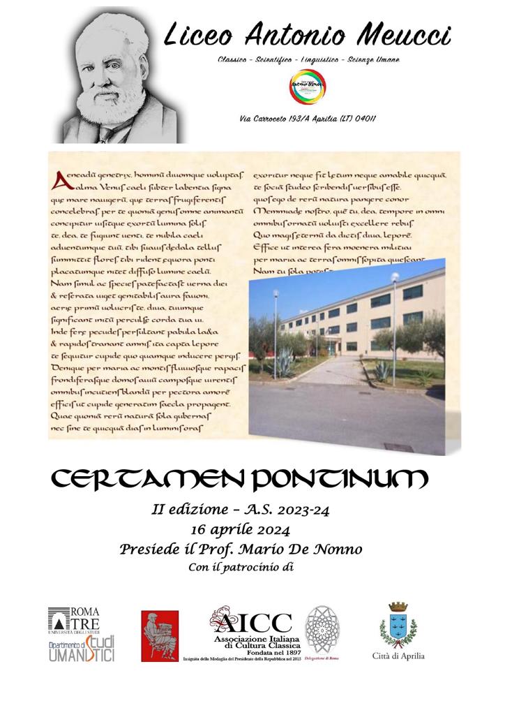 Nell’anno scolastico 2023/24 è stata bandita la seconda edizione del concorso che ha carattere di concorso nazionale aperto a studentesse e studenti di tutti i licei italiani. L’iniziativa gode del patrocinio del Dipartimento di Studi Umanistici dell’Università degli Studi Roma Tre, del Comune di Aprilia e dell’Associazione Italiana di Cultura Classica (AICC, sezione di Roma). Si conferma Presidente Onorario del concorso il Prof. Mario De Nonno, professore ordinario di Letteratura Latina presso il Dipartimento di Studi Umanistici dell’Università degli Studi Roma Tre.